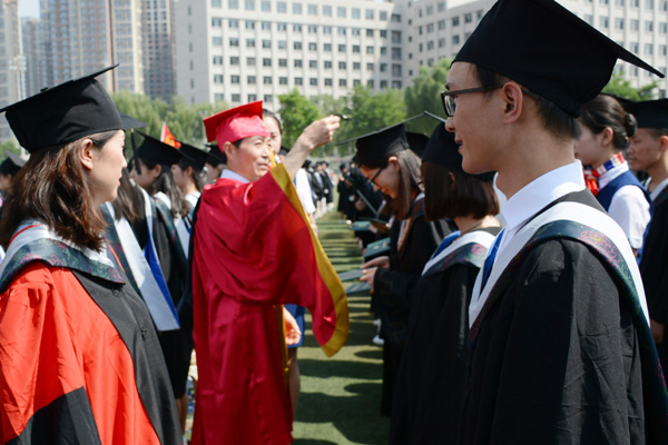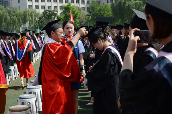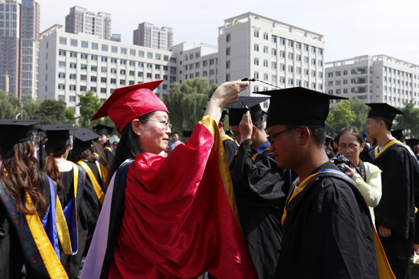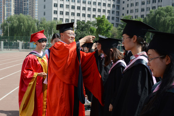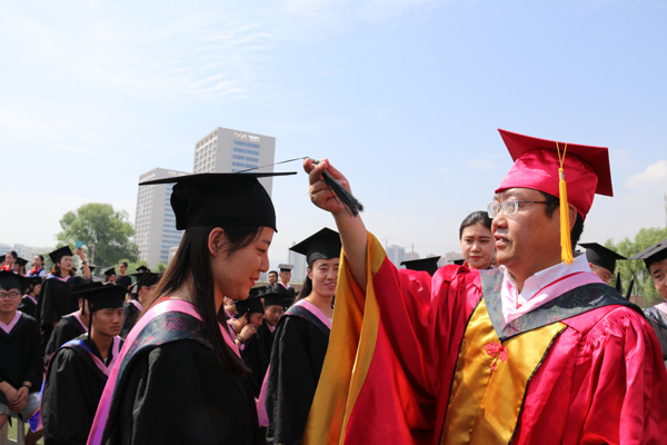 副校长姜秋霞宣读了《beat365官方网站关于授予白慕容等3182名本科毕业生学士学位的决定》。校领导为每一位毕业生正冠拨苏、颁发学位证。