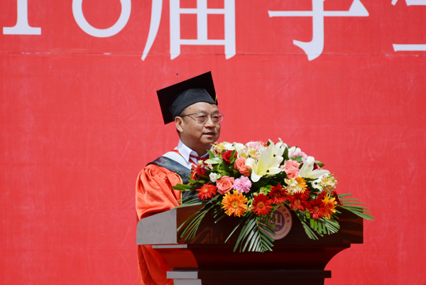 在毕业生即将远行之际,他提出三点希望与大家共勉:“一是坚守。要坚守正气善道。要坚守初心使命。要坚守学思践悟。要善于聆听时代的声音,通过不断的学习实践与时俱进,为个人和人类创造更好的未来;二是超越。要敢于尝试不同的东西,不断超越自我、积极进取。希望大家能好好利用自己的力量,“趁着年轻,偏要勉强”,改变和超越现状。三是创新。青年是社会上最富活力、最具创造性的群体,理应走在创新创造的前列。同学们要有敢为人先的锐气,勇于解放思想、与时俱进,竖立继承前人、超越前人的雄心壮志,积极上下求索、开拓进取。‘以青春之我,创建青春之国家,青春之民族。’要有逢山开路、遇河架桥的意志,为创新创造而百折不挠、勇往直前;要有探索真知、求真务实的态度,在立足本职的创新创造中实现小我、成就大我。”