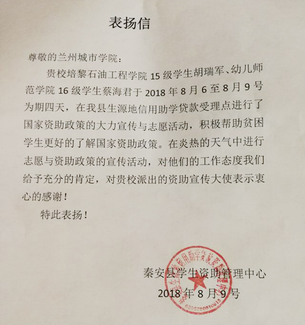 “学生资助宣传大使,我有幸成为其中的一员,我们受助于国家、受助于学校,能够有这样一个机会让我们走进乡村、走进街道并向学弟学妹讲解国家的资助政策,回报学校,做一点力所能及的事情,非常感谢学校和老师。虽然县教育局给我和同伴颁发了表扬信,但我认为自己做的还很不够”。来自培黎石油学院的胡瑞军同学这样表达自己的心声。