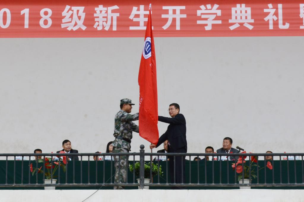 典礼上,校党委常委、副校长李慕堂为军训团授旗。军训教官代表张志伟对参加军训的2018级新同学提出了训练要求。