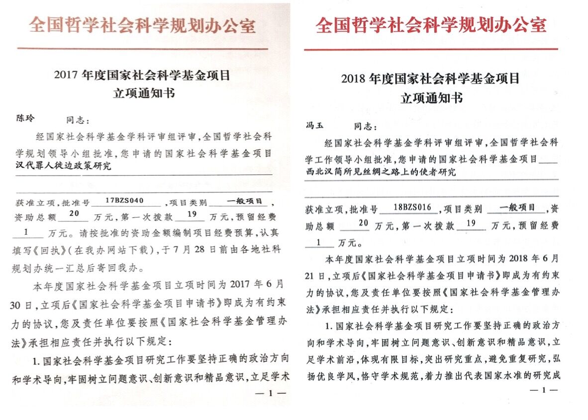 2017—2018年,孙占宇主持的国家社科基金项目“简帛日书所见秦汉民众生活研究”、内蒙古文物考古研究所委托项目“新出额济纳汉简整理与研究”相继完成,并提交结项。马智全主持的国家社科基金项目“敦煌悬泉置墙壁题记整理与研究”进展较快,亦接近完成。这两年,该学科团队新获批国家社科基金项目两项,分别是陈玲主持的“汉代罪人徙边政策研究”(17BZS040)、冯玉主持的“西北汉简所见丝绸之路上的使者研究”(18BZS016),鼓舞了学科团队的士气。截至目前,该学科团队先后承担各级科研项目十余项,获资助经费一百余万元。