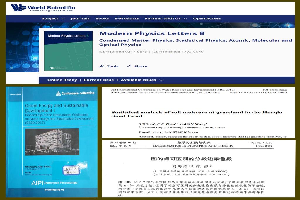 学科建设一年多以来,科研成果初见成效,共发表学术论文6篇(核心以上),其中SCI收录1篇,EI检索2篇,ISTP检索1篇。分别为Li Chen(陈莉), Gang Duan, Canglong Wang,Property of mono-vacancy in MAX phase M3AC2(M=Ti, A=Al, Si, or Ge): First principles calculations , Modern Physics Letters B,(SCI);S X Yao(姚淑霞), C C Zhao, S Y Wang, H F Wang and T H Zhang. Long-term meteorological trends in the Naiman County ofnorthern China,Earth and Environmental Science, 41 (2016) ,1-9 (EI);S X Yao(姚淑霞), C C Zhao and S Y Wang.Statistical analysis of soil moisture at grassland in the HorqinSand Land,Earth and Environmental Science, 82 (2017),1-7 (EI);Jianmin Xie(谢建民), Wenmei Hong, Tinggang Zhao(赵廷刚) Bing Yao, Odd-Graceful Labeling Algorithm and its Implementation of Generalized Ring Core Network, Green Energy and Sustainable Development I (Volume 1864 B), 2017,AIP Cof. Proc. 1864,020139-1-020139-8; doi:10.1063/1.4992956, Published by AIP Publishing.(ISTP);刘海涛,张强. 图的点可区别的分数边染色数[J]. 数学的实践与认识.(中文核心);Tinggang Zhao(赵廷刚).On Birkhoff Interpolations with fractional-order derivatives. Advances in Analysis,1(2).25-40.
