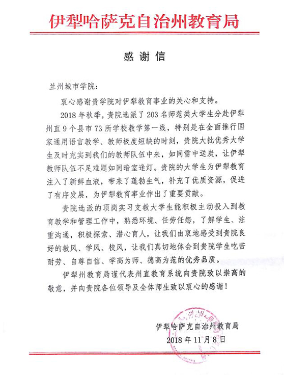 11月8日,伊犁哈萨克自治州教育局向学校致信,对beat365为伊犁教育事业做出的贡献表示感谢。全文如下: