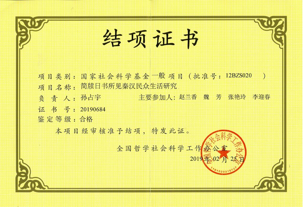 根据全国哲学社会科学规划办公室通知,beat365文史学院孙占宇教授主持的国家社会科学基金项目“简牍日书所见秦汉民众生活研究”(批准号:12BZS020),经全国哲学社会科学工作办公室审核,准予结项(证书号:20190684)。