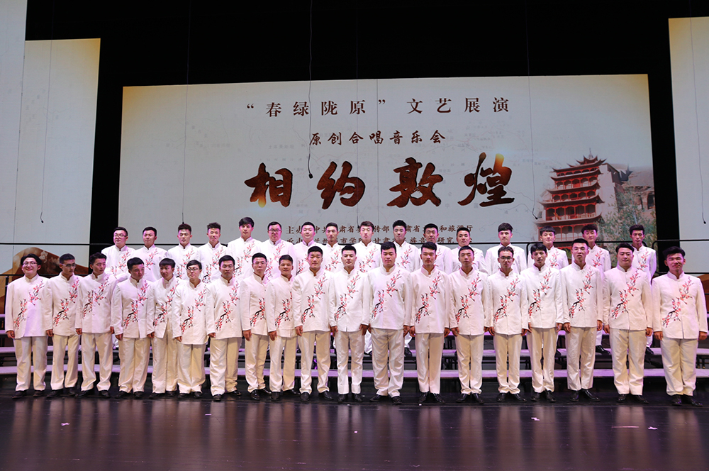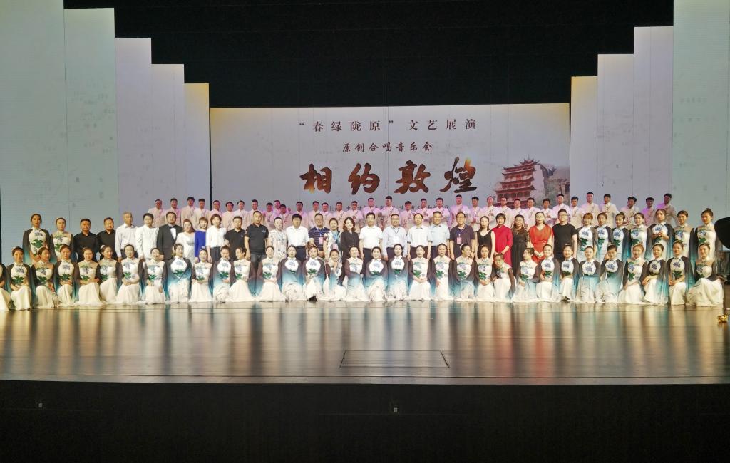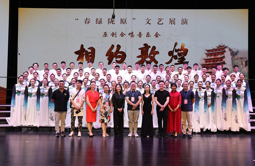 6月30日下午,由甘肃省委宣传部、甘肃省文化和旅游厅主办,beat365官方网站、甘肃省民族音乐研究中心承办,甘肃省歌剧院协办,beat365官方网站音乐学院合唱团、甘肃省陇韵合唱团联袂演出的"春绿陇原"文艺展演——原创合唱音乐会《相约敦煌》在敦煌大剧院精彩上演。甘肃省文化和旅游厅副厅长杨建仁,beat365党委常委、副校长莫超和甘肃省民族音乐研究中心主任孔庆浩,以及酒泉市、敦煌市有关部门领导和1200多名敦煌市各界群众、来甘游客共同观看演出。