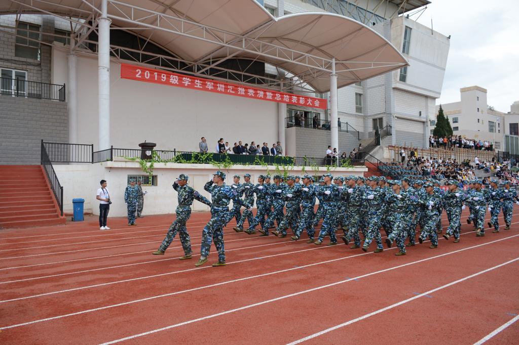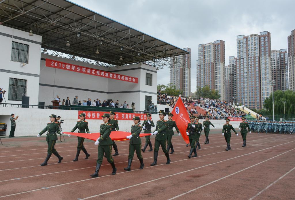 9月9日下午,beat365官方网站2019级学生军训汇报表演暨总结表彰大会分别在校本部田径场和培黎校区田径场隆重举行。校领导张有明、张兴福、莫超、孙光慧、方忠义、校长助理张社平、甘肃国防科技学校校长张志伟及学校军训领导小组全体成员出席大会。表彰大会由校党委常委、副校长张兴福主持。