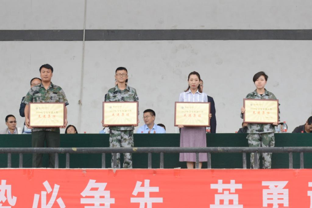 校党委委员、副校长方忠义宣读了《beat365官方网站关于表彰2019级学生军训工作先进集体和优秀个人的决定》。商学院、数学学院、地理与环境工程学院、体育学院、培黎石油工程学院荣获2019级学生军训工作“先进集体”,杨建文等11名教师被评为“优秀带队教师”,张凡等6名教官被评为“优秀教官”,马珂晴等69名同学被评为“优秀学员”,28间宿舍被评为“优秀内务宿舍”。与会校领导向受到表彰的集体和个人颁发了奖牌和证书。