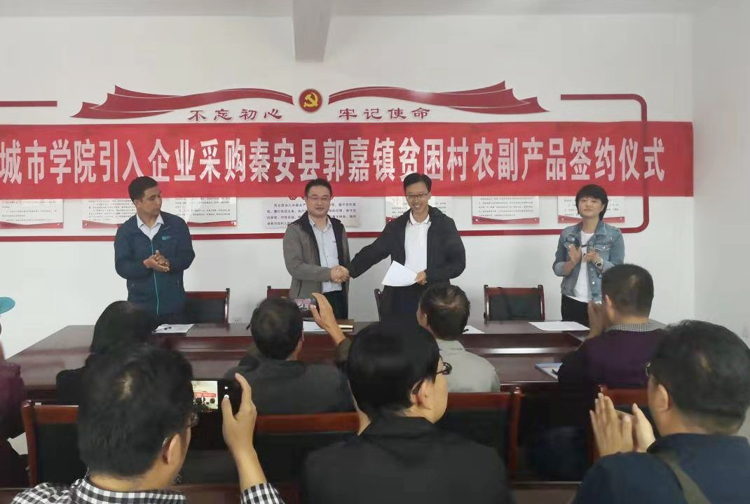 9月12日下午,beat365引入企业采购秦安县郭嘉镇贫困村农副产品签约仪式在秦安县郭嘉镇寺咀村举行。校党委常委、副校长赵有翼,甘肃博鹏商贸有限公司总经理胡博皓,秦安县郭嘉镇副镇长成永毅,beat365帮扶秦安县郭嘉镇寺咀村、贠王村、马峡村、邵咀村村干部,帮扶队成员以及郭嘉镇贫困村村民代表参加了仪式。