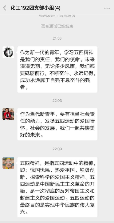 各学院团委、各班级团支部积极组织策划活动方案,通过讲述五四故事、观看五四运动视频、唱响共青团团歌、佩戴共青团团徽、五四运动知识竞赛等线上方式,引导广大团员青年发扬伟大五四精神、高举爱国旗帜、胸怀远大志向。