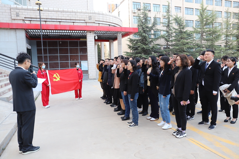 升旗仪式后,全体师生党员面向党旗庄严宣誓,重温入党誓词。庄严的誓词在广场上响起,表达了师生对党的衷心拥护和爱党敬党护党的坚定信念。