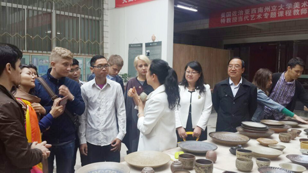 留学生们饶有兴趣的参观了美术学院陶艺工作室、服装工作室、纤维工作室及漆艺工作室,详细了解了工作室的特色文化,观摩了陶艺、漆艺、纤维的制作过程。张国锦一行对美术学院错位发展、突出优势的办学思路给予了积极评价,并愿意定制相关工艺产品。双方表示,今后要进一步加强合作,密切在实践教学方面的联系,提高办学水平。