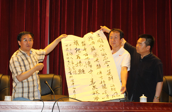 尚墨先生首先对书法艺术的发展作了较全面的线性梳理,对诗意书法进行了透彻而全面的诠释和阐述。将书法与古体诗词进行了形式与韵律上的对比和参照,结合从古至今书法名家及自身创作经历,强调中国诗词与书法艺术的相互借鉴关系。尚墨先生以其生动的语言,专业的视角,高度总结了诗词艺术与书法艺术之间在审美机理、韵律节奏、抒情表达,取材来源等方面的密切联系,特别对诗词和书法之间互为载体的密切关系做了深入准确地剖析。使听众直观而又深刻的认识到了诗学艺术对于书法创作的重要性和对艺术高度的形成。其次,对于诗词的韵律平仄做了详尽而又形象的讲解,同时又贯穿介绍书法练习的方式方法,品评古代书法经典作品,为同学们解析书法研习之道,尤其是对碑之雄健厚重,贴之雅逸潇洒的特点进行了专业的分析。最后,尚墨先生就诗意书法的核心内涵谈到了书法学习从技法层面到文化高度的升华,以及诗词对于书法艺术文化底蕴形成的重要性做了充分的论证。讲座中尚墨先生儒雅的气度、严谨的论证、渊博的知识、风趣的语言都给学院师生留下了深刻的印象,整个讲座将学术与实践相结合,为beat365师生献上了一份丰盛的书法文化大餐。讲座结束后尚先生向学校赠送了自己精心创作的诗书作品一副。