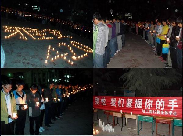 同时,培黎校区、东校区学生会也和同学们一起举行了祈福平安活动,为逝者祈福,为雅安祈福。