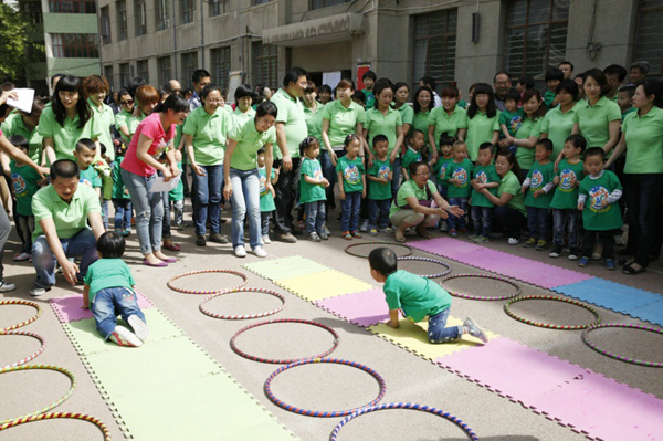 5月3日下午,东校区幼儿园全体家长、幼儿和老师在学院操场进行了一场别开生面的大型亲子操表演和教师精心组织的亲子游戏活动。幼儿和家长身穿绿色T恤,表现幼儿生机勃勃的成长,教师身穿粉色T恤,表现教师用爱心去浇灌嫩芽。整个活动得到了家长的大力支持,充分发挥家长委员会的作用,家委会成员亲自为幼儿和家长购买、发放服装,协助组织大型亲子操表演的相关工作。