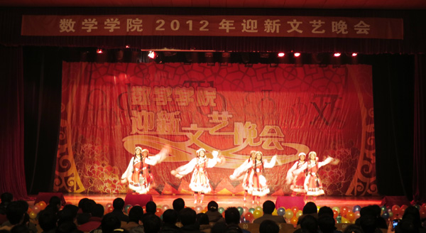 12月6日晚,数学学院“放飞青春 追逐梦想”2012年迎新文艺晚会在西校区大礼堂举行。晚会在开场舞“经典breaking”中热烈开幕,晚会中,以体现校园生活、展示当代大学生风采为主的舞蹈、相声、歌曲等为主要内容的12个节目相继上台演出,获得了观众们激烈的掌声。其中相声“宿舍轶事”带给大家阵阵欢笑,以诙谐幽默的方式展示了当代大学生对学习、生活、网络及爱情的独特理解。整台晚会由学生们自编自导,展现了他们爱国、爱校和热爱生活的良好风貌。