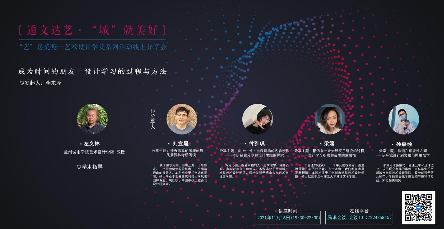 艺术设计学院环境设计系联系四位往届毕业生校友,策划举办主题为“成为时间的朋友----设计学习的过程与方法”线上专业学习经验分享会,缓解由于疫情防控封闭导致学生的心理焦虑和不适感,引导学生珍惜时光,激发起学生学习奋进的活力和热情。
