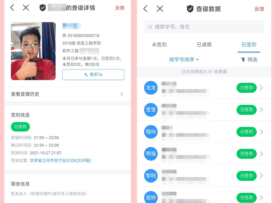 作为刚合并的新学院,全院师生人数较多,且学生发布在两个校区,防疫工作压力巨大。为实现学生精准化管理,学院在学生日常管理中上线“辅导猫”管理系统,并邀请辅导猫APP平台首席工程师为学院党政领导、系部主任以及全体班主任详细介绍了学生管理流程。教师能通过辅导猫快速掌握学生位置以及健康情况,在线查看寝室卫生情况、班会情况,学生数据收集更加便捷、智能、精准,大大提高了学院学生工作的信息化管理水平,为疫情防控提供了可靠的数据保障。