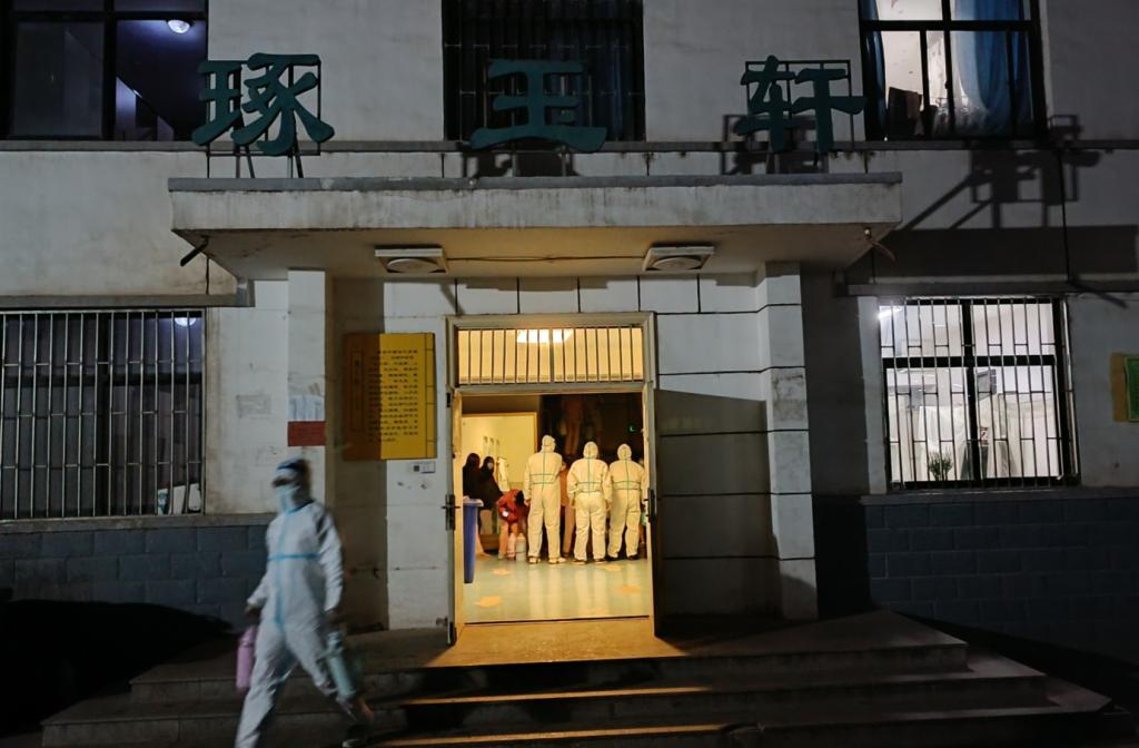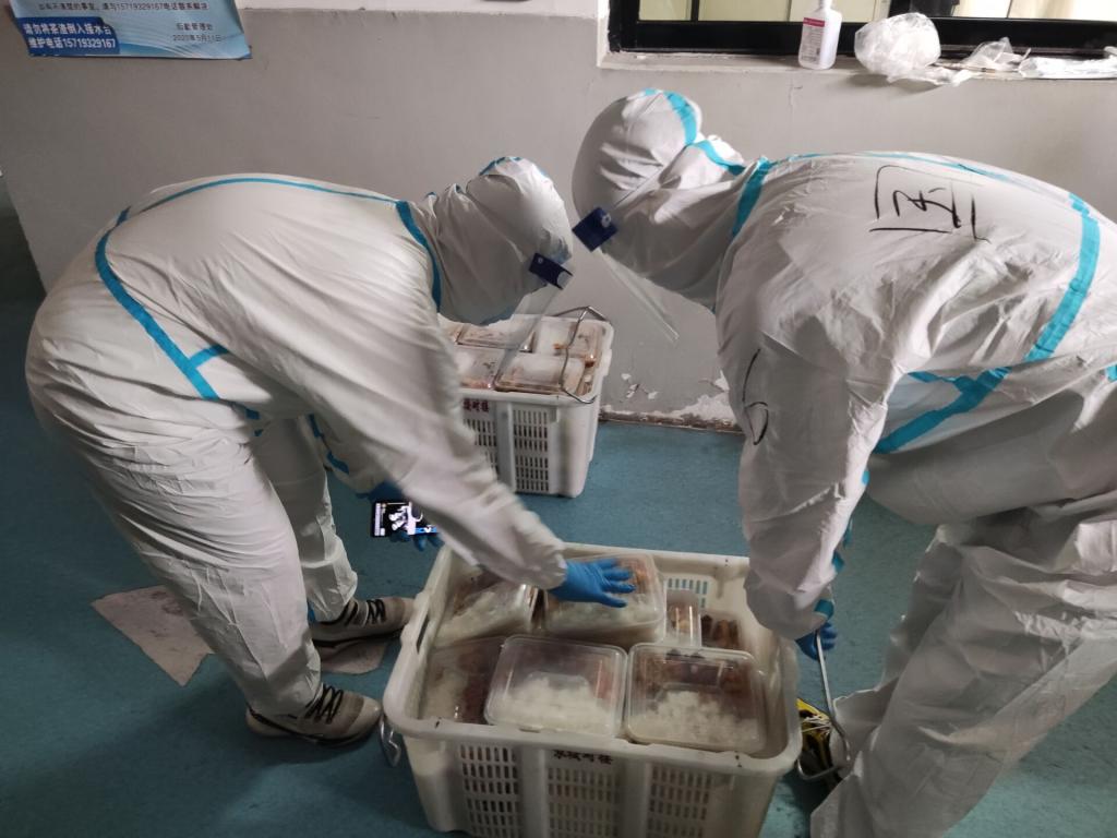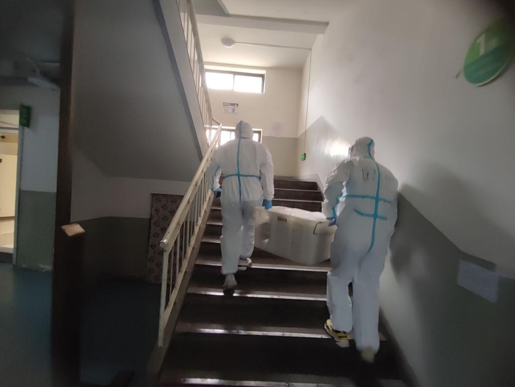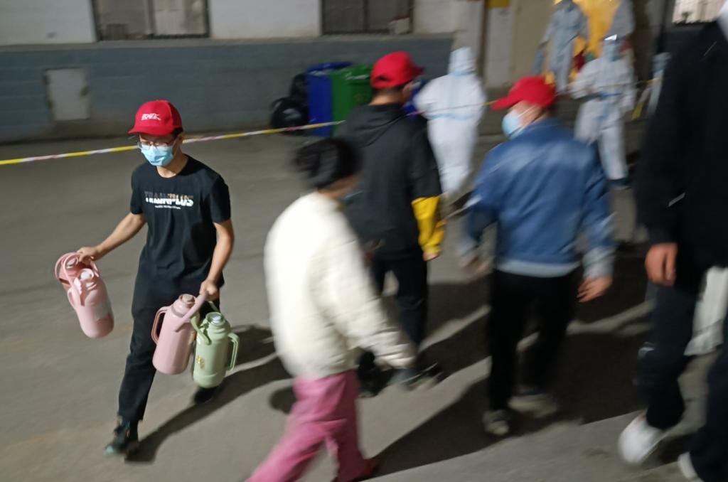 国旗护卫队的志愿者们主动承担封控区域女生7号楼的生活物资转运工作