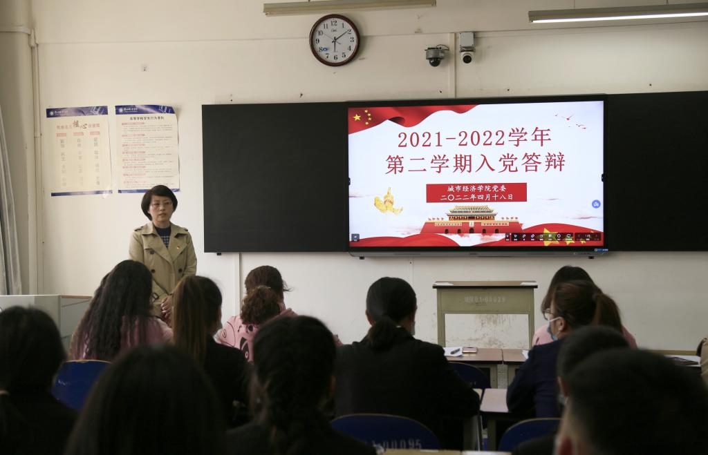 4月18日,城市经济学院举行2021-2022学年第二学期入党积极分子答辩会。学院党委书记、副书记,学生党支部书记、团学办及院办教师共六人组成答辩小组委员会,24名入党积极分子参加答辩。