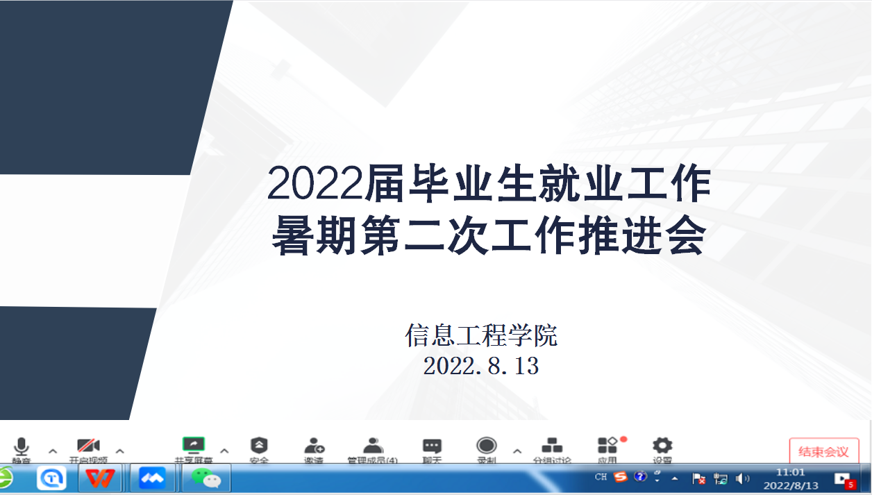 8月13日上午,信息工程学院线上召开重点工作推进会暨2022届毕业生暑期第二次就业工作推进会。