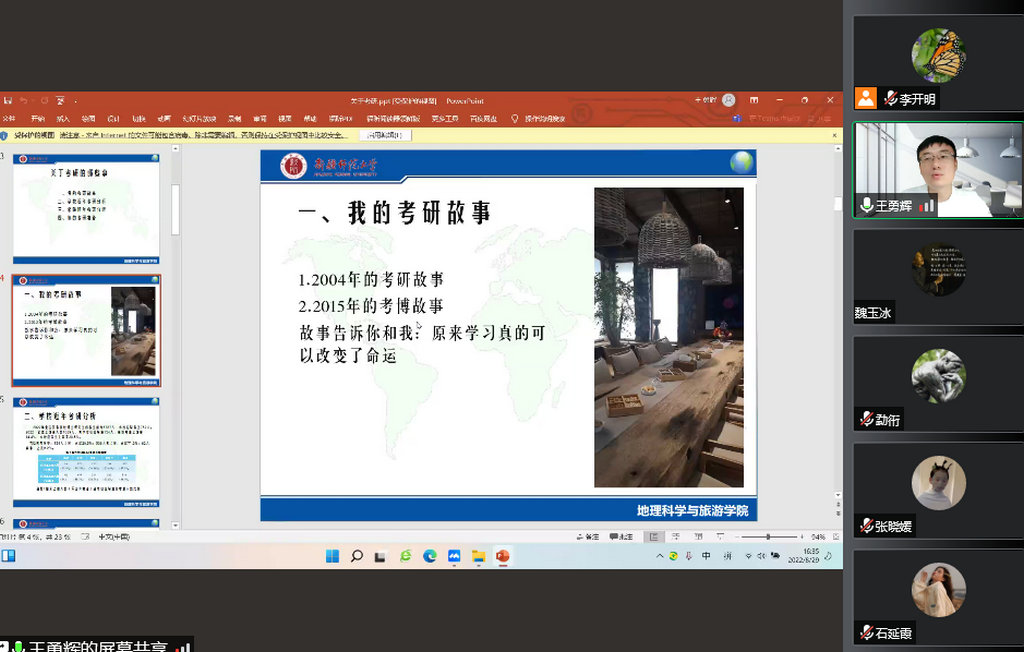 活动中,王勇辉以《关于考研那点事》为题,结合自己考研经历,分享了考研故事与报考心得,介绍了新疆师范大学地理与旅游学院研究生报考情况,以详细的数据分析和生动的案例,对同学们报考学校和专业选择给出了意见和建议。