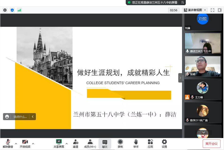 1016日,应信息工程学院的邀请,兰州市第五十八中学薛洁老师在线为信息工程学院学生作了题为《做好生涯规划,成就精彩人生》的主题报告。数学与应用数学专业的一、二年级学生参加报告会。