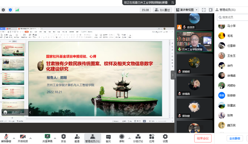 1021日下午,传媒学院邀请兰州工业学院计算机与人工智能学院副院长郑刚教授在线作了《国家社科基金项目申报经验心得》的专题讲座,传媒学院全体专任教师参加了讲座。