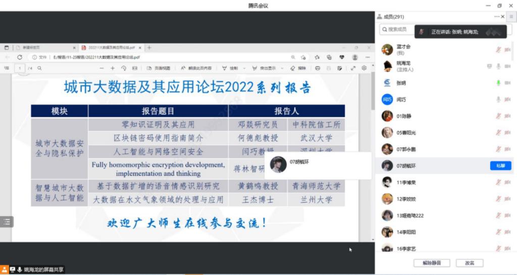本届“城市大数据及其应用论坛2022”设置了“城市大数据安全与隐私保护”和“智慧城市大数据与人工智能”两个模块。邓燚在其报告《零知识证明及其应用》中指出,零知识证明对密码学和计算理论都有着深远影响,它不但是密码学中的一个基础性工具,其研究也衍生出了计算理论领域中一些强大的技术(如算术化)和深刻的结果(如PCP定理)。何德彪的报告《区块链密码使用指南》详细讲述了编制定位与目标、内容与结构和工作方案,并对部分推荐隐私保护算法进行具体讨论。闫巧在其报告《人工智能与网络安全》中介绍了人工智能技术赋能网络空间安全的研究和人工智能自身脆弱性的研究。蒋林智的报告《Fully homomorphic encryption development, implementation and thinking》回顾了全同态加密设计的发展历程并探讨了全同态加密的工业化应用前景。黄鹤鸣的报告《基于数据扩增的语音情感识别研究》针对语音情感数据资源稀缺问题,提出了多域集成、含噪数据扩增以及多信噪比整合技术来扩充语音情感数据集,从而缓解数据资源稀缺、特征表征性较差以及声学模型鲁棒性和泛化性较差的问题。王杰在报告《大数据在水文气象领域的处理与应用》中讲述了大数据的特征,并对水文气象数据的处理及应用进行分析研究。