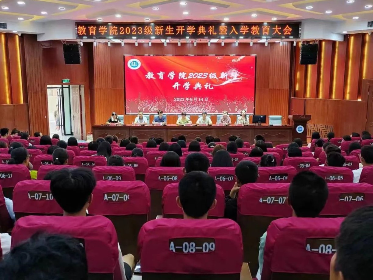 教育学院2023级学生开学典礼上,领导班子介绍了学院的办学历史、专业特色、教学科研、师资队伍以及教育资源等方面的情况,鼓励莘莘学子珍惜时光,努力学习,提升综合素质和专业能力;学院党委书记鼓励同学们在新的起点上,厚植家国情怀,勇担时代使命,在大学的岁月里踔厉奋发、自强不息、砥砺前行、追求卓越。