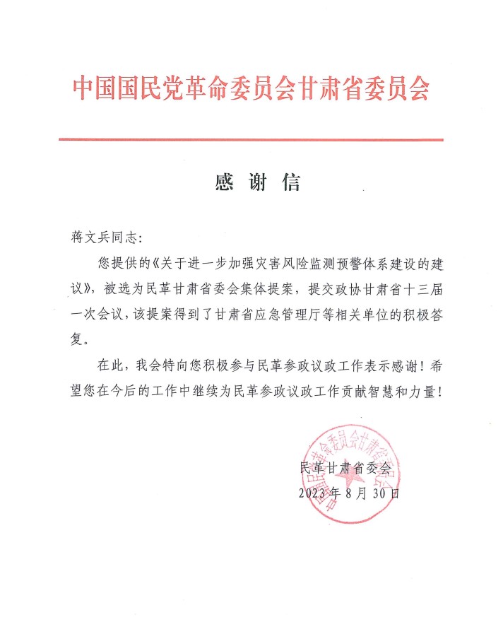 beat365民革党员、城市经济学院副教授蒋文兵撰写的《关于进一步加强灾害风险监测预警体系建设的建议》,被选为民革甘肃省委会集体提案,提交政协甘肃省十三届一次全会,提案得到了甘肃省应急管理厅等相关单位的积极答复。