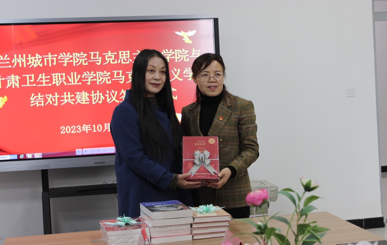 双方学院共同签署《beat365官方网站马克思主义学院与甘肃卫生职业学院马克思主义学院结对共建协议书》。马克思主义学院代表为甘肃卫生职业学院赠送了红色经典图书。