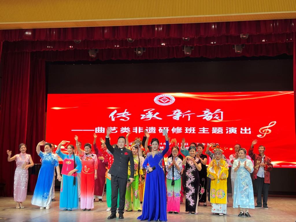 结业仪式结束后,为了更好的展现本次研修成果,全体研修班学员奉献了一场题为“传承新韵——曲艺类非遗研修班主题演出”的精彩的汇报演出,学员们将各自非遗传承项目带上了舞台。历史久远的非遗项目,精湛的表演技艺,丰富多彩的曲艺类节目,激昂深情的声腔以及学员们自信的精神面貌,使本次演出获得了极大的成功,得到社会的良好赞誉。