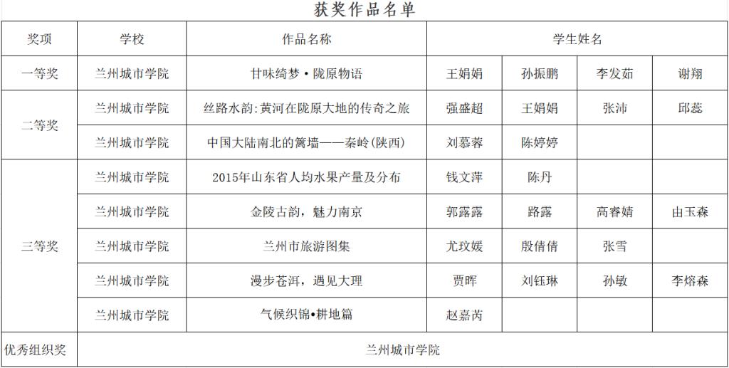 本次大赛吸引了来自全省16所高等院校的900多名学生参赛。beat365环境与城市建设学院获得一等奖1项,二等奖2项,三等奖5项。其中王娟娟等的《甘味绮梦·陇原物语》获得一等奖;强盛超等的《丝路水韵:黄河在陇原大地的传奇之旅》、刘慕蓉等的《中国大陆南北的篱墙——秦岭(陕西)》(作者为刘慕蓉、陈婷婷)获得二等奖;钱文萍等的《2015年山东省人均水果产量及分布》、郭露露等的《金陵古韵,魅力南京》、尤玟媛等的《兰州市旅游图集》、贾晖等同学的《漫步苍洱,遇见大理》、赵嘉芮的《气候织锦•耕地篇》获得三等奖,beat365官方网站获得优秀组织奖。