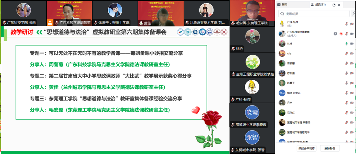 12月2日,由广东省高校思政课区域协同创新中心(东莞理工学院)与广东科技学院马克思主义学院联合主办,我院德法课教研室与东北石油大学、甘肃卫生职业学院、培黎职业学院、湛江科技学院和柳州工学院7所高校德法课教研室共同承办的“思想道德与法治”虚拟教研室第六期集体备课研讨会在云端隆重举行。 “粤黑陇桂”四省20所高校马克思主义学院相关领导及教师共计90余人参会。