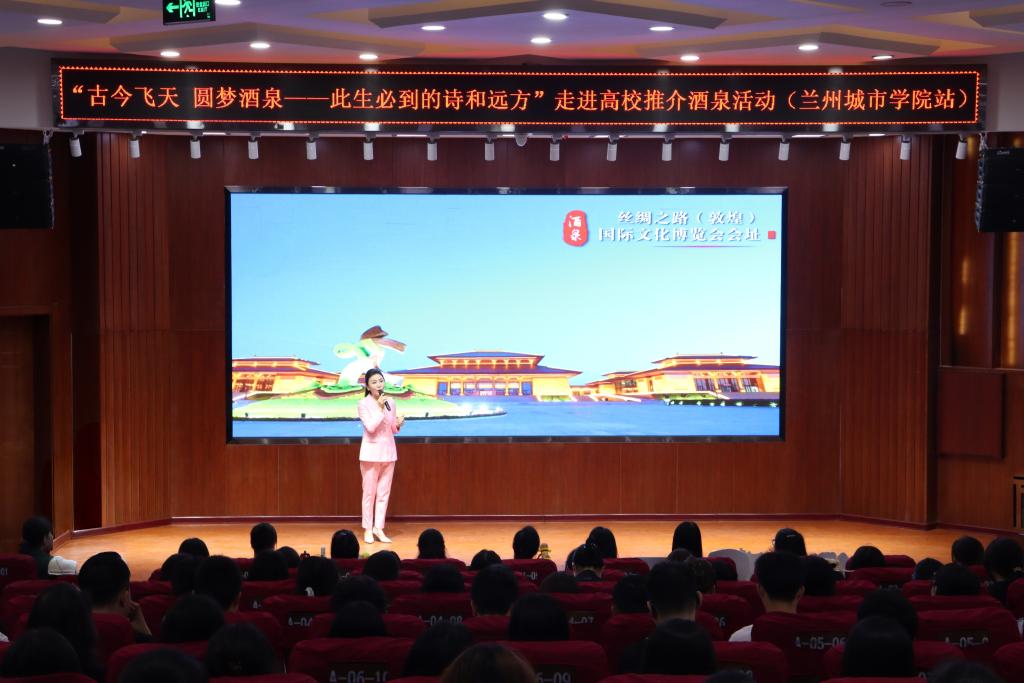 在大学生活动中心,推介官从敦煌莫高窟的千年壁画到酒泉卫星发射中心的航天壮举,从玉门“铁人精神”的石油史诗到肃北草原马蹄踏雪的蒙古长调,从瓜州戈壁雕塑长廊的“大地之子”到阿克塞海子草原邂逅候鸟的浪漫,再到金塔沙漠胡杨林的秋日童话,带领现场师生穿越时空,共同探寻酒泉的璀璨魅力。
