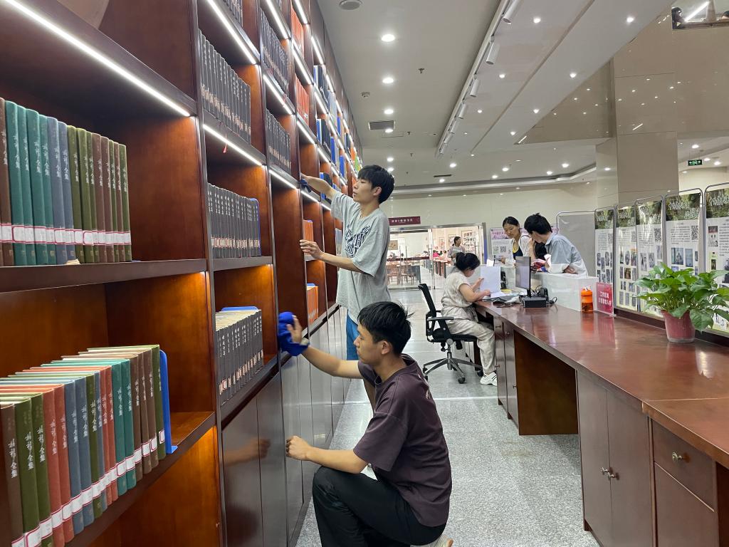 在馆员们的指导下,同学们仔细核对密集书库书籍信息,将一本本图书按照分类规则准确归位,穿梭于书架间,手持清洁工具细致擦拭书架。