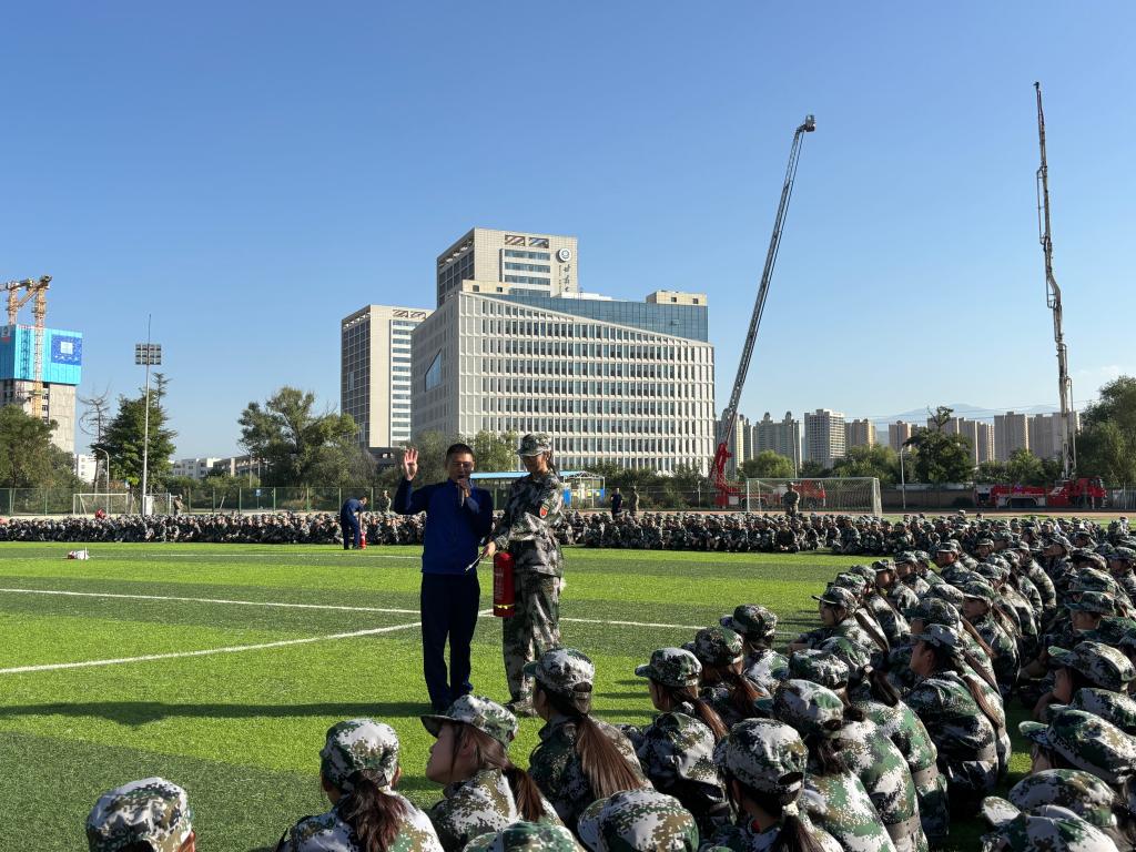 活动将军训期间的消防安全教育作为重点环节。安宁区消防大队教官通过理论讲解与实物操作相结合的方式,系统介绍了灭火器使用、消防水带连接等基本技能,并组织开展了应急疏散与自救互救实战演练,同步延伸讲解防震避险知识,以直观易懂的方式帮助新生掌握实用安全知识。