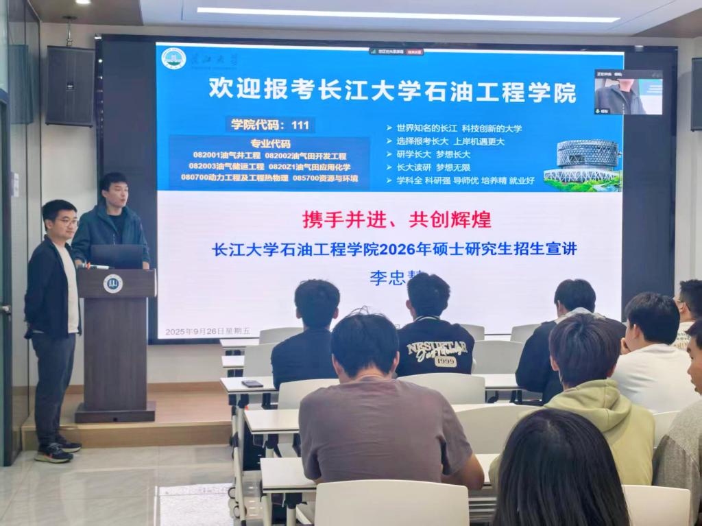 为帮助学生明确考研方向、优化备考策略,9月26日下午,培黎石油工程学院在大学生就业实践实训基地举办考研招生宣讲会。会议邀请长江大学石油工程学院与兰州理工大学石油化工学院招生团队来校宣讲,采用线上线下相结合的方式进行,两校区学生通过现场参与或腾讯会议直播踊跃参加。