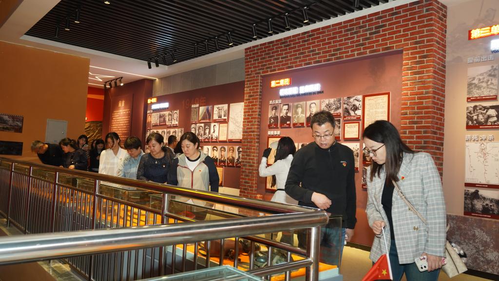 在基地讲解员的引导下,师生党员参观了红色纪念馆。馆内通过历史图片、革命文物和文献资料,系统展现了沈家岭战役的历程与革命先辈的英勇事迹。讲解围绕“烽火岁月”“浴血奋战”“精神传承”三个主题展开,生动讲述了革命战士在艰苦环境中为民族独立和人民解放奋斗的历史。