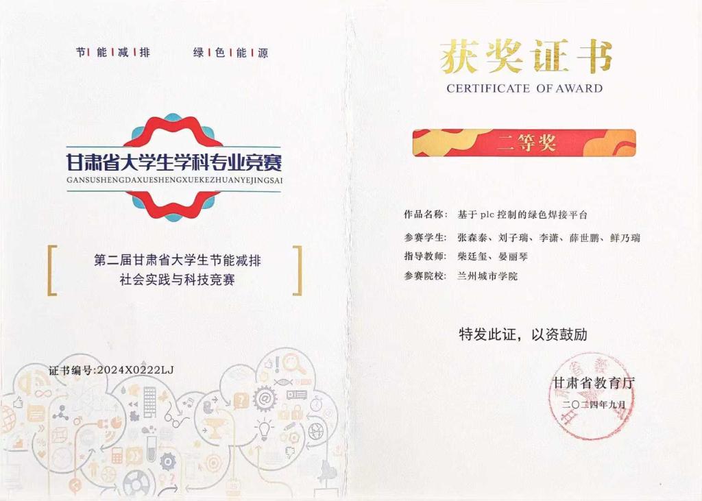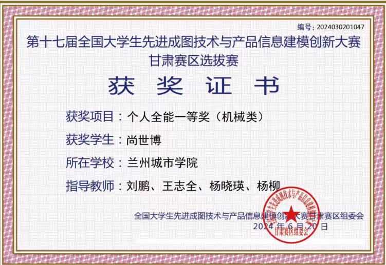 学科竞赛硕果累累:近年来,累计获“高教杯”全国大学生先进成图技术与产品信息建模创新大赛一等奖1项、二等奖1项,优秀指导教师2项,三等奖5项;获中国工程机器人大赛暨国际公开赛三等奖1项;获得中国国际大学生创新大赛甘肃省分赛银奖2项,三等奖2项;荣获全国大学生第十四届金相大赛省级一等奖2项、二等奖1项,国家三等奖3项;获全国大学生创新创业大赛优秀奖1项;获“挑战杯”甘肃省大学生课外学术科技作品竞赛二等奖2项,三等奖1项;获大学生英语竞赛三等奖2项;获十六届全国大学生数学竞赛三等奖1项,省级竞赛获奖共30余项。