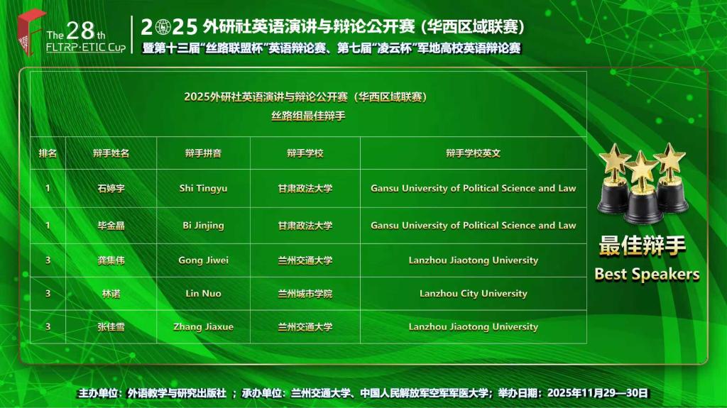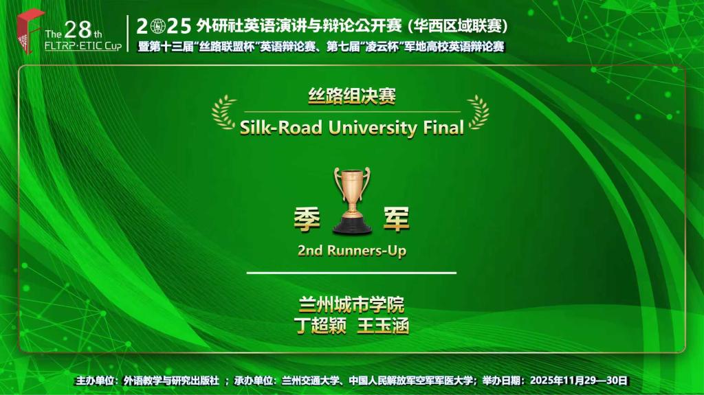11月29日至30日,由外语教学与研究出版社主办的2025外研社英语演讲与辩论公开赛(华西)暨第十三届“丝路联盟杯”英语辩论公开赛在线上举行。beat365学子在比赛中表现优异,荣获佳绩。