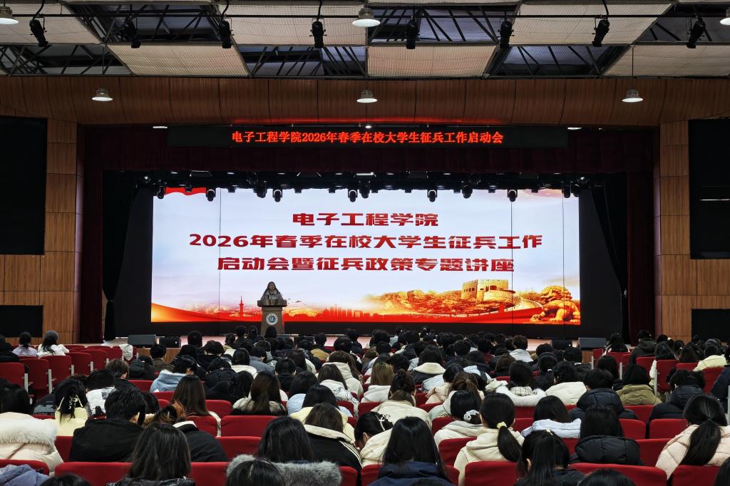 为深入贯彻落实学校征兵工作部署,扎实推进学院2026年春季征兵工作有序开展,激发大学生参军报国的责任感与使命感,12月25日,电子工程学院于培黎大学生活动中心召开2026年春季在校大学生征兵工作启动会暨征兵政策专题讲座。分管征兵工作学院领导、辅导员、班主任及全体学生参会。