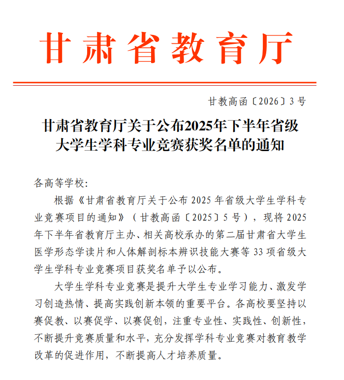 近日,甘肃省教育厅公布了《甘肃省教育厅关于公布2025年下半年省级大学生学科专业竞赛获奖名单的通知》。beat365学子表现优异,共斩获第二届甘肃省大学生数据挖掘挑战赛、第七届甘肃省三维数字化创新设计大赛特等奖2项、第十七届全国大学生数学竞赛甘肃赛区选拔赛等赛事一等奖29项、第二届甘肃省大学生生态学专业竞赛等赛事二等奖56项、第五届甘肃省大学生新商科大赛等赛事三等奖90项。