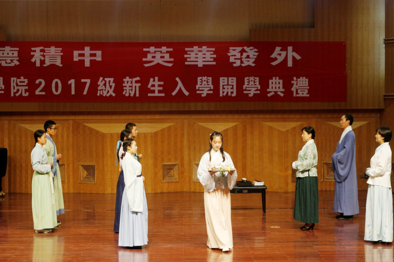 典礼上,全院教师盛装登台,由司仪向同学们逐一介绍老师及其主讲课程。随后,教师、新生代表身着汉服,举行了别开生面、极富中华传统特色的拜师礼活动。由学生向老师敬献了代表学费的“束脩”,老师代表也对新生表示了感谢,并寄予了殷切的期望。礼成后,师生代表共同吟诵了中华经典“四书”之一《大学》的开篇。