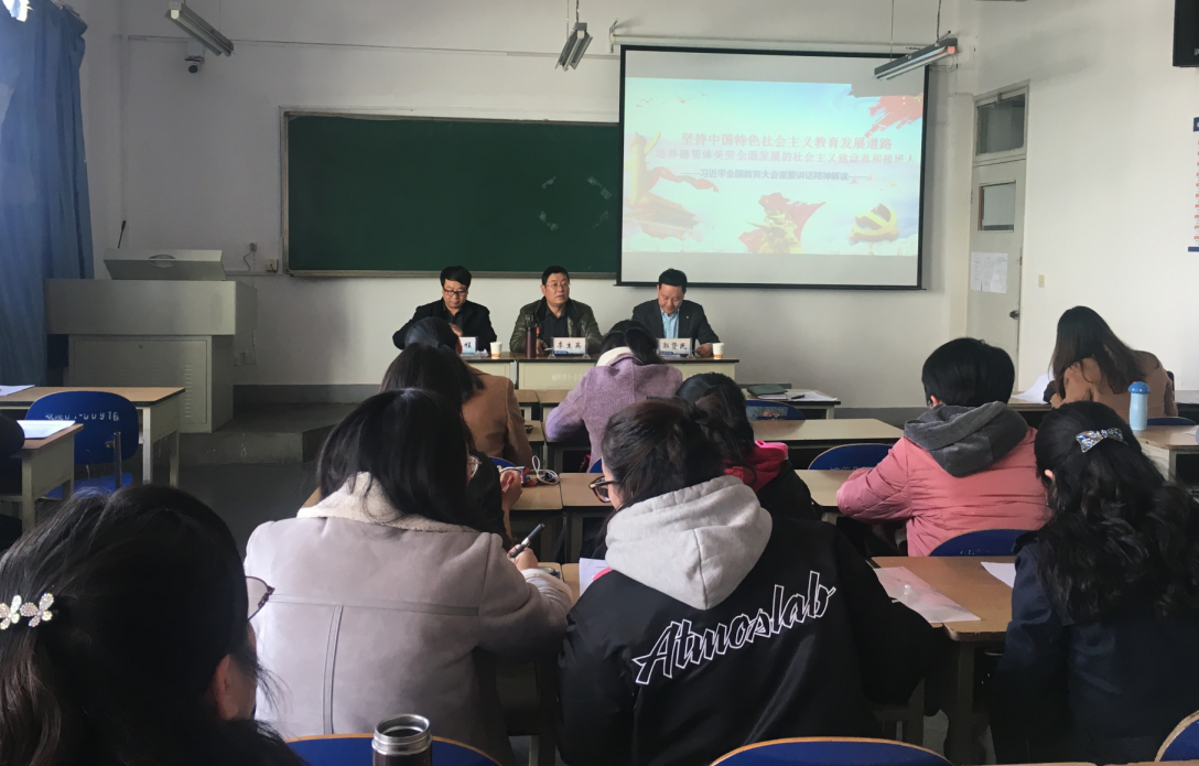 11月30日下午,国际文化翻译学院组织全体教职工集体学习全国教育大会精神。校宣讲团成员、教务处处长李生英教授以《坚持中国特色社会主义教育发展道路,培养德智体美劳全面发展的社会主义建设者和接班人》为题进行了宣讲。