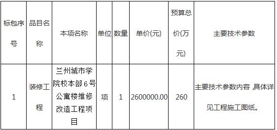 受beat365官方网站委托,兰州金立招标代理有限公司将以竞争性磋商方式,对beat365官方网站校本部6号公寓楼维修改造工程项目实施政府采购。现欢迎合格的供应商参加磋商。