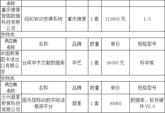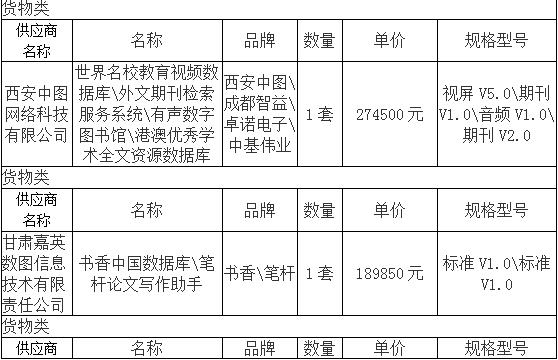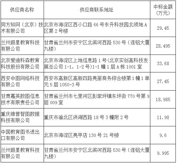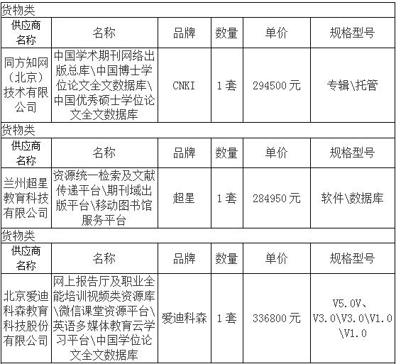 第一包中标供应商:同方知网(北京)技术有限公司 第二包中标供应商:兰州超星教育科技有限公司 第三包中标供应商:北京爱迪科森教育科技股份有限公司 第四包中标供应商:西安中图网络科技有限公司 第五包中标供应商:甘肃嘉英数图信息技术有限责任公司 第六包中标供应商:重庆维普智图数据科技有限公司 第七包中标供应商:中国教育图书进出口有限公司 第八包中标供应商:兰州超星教育科技有限公司
