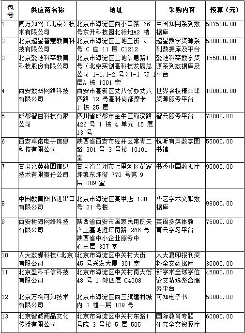 拟采购的货物或服务的说明:图书馆数字资源采购与续订(共13个包,具体要求详见单一来源采购文件)