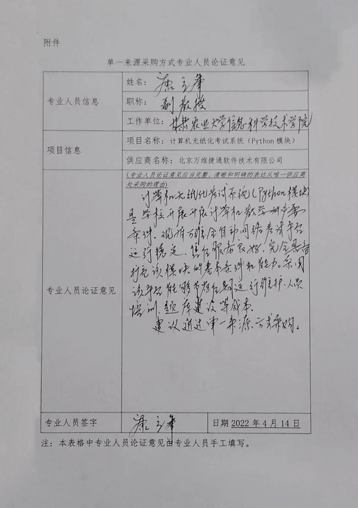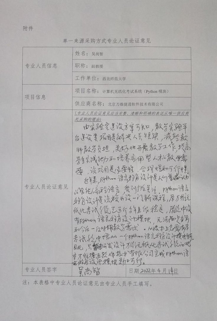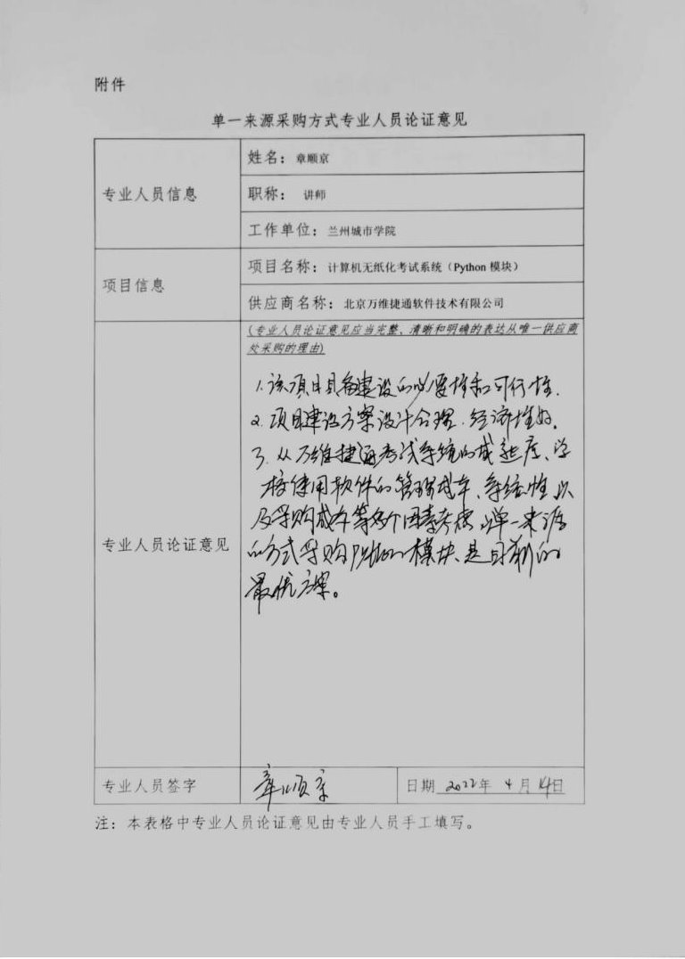 (五)采用单一来源采购方式的原因:原考试系统运行多年且很稳定,由于原系统中没有Python语言程序设计模块,无法满足当前和今后一段时期教学需求,从技术上急需在万维考试系统基础上增加一个Python语言程序设计模块,只能由开发设计万维无纸化考试系统的北京万维捷通软件技术有限公司完成Python语言程序设计模块,因此采用单一来源方式采购。