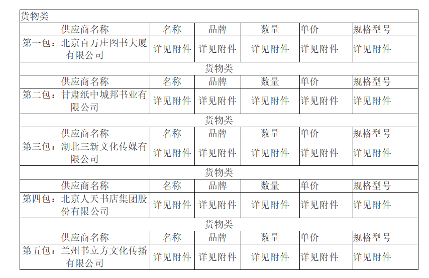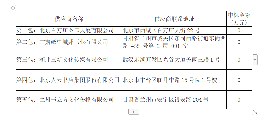 第一包:北京百万庄图书大厦有限公司,中标折扣率:30%;第二包:甘肃纸中城邦书业有限公司,中标折扣率:30%;第三包:湖北三新文化传媒有限公司,中标折扣率:30%;第四包:北京人天书店集团股份有限公司,中标折扣率:30%;第五包:兰州书立方文化传播有限公司,中标折扣率:30%。